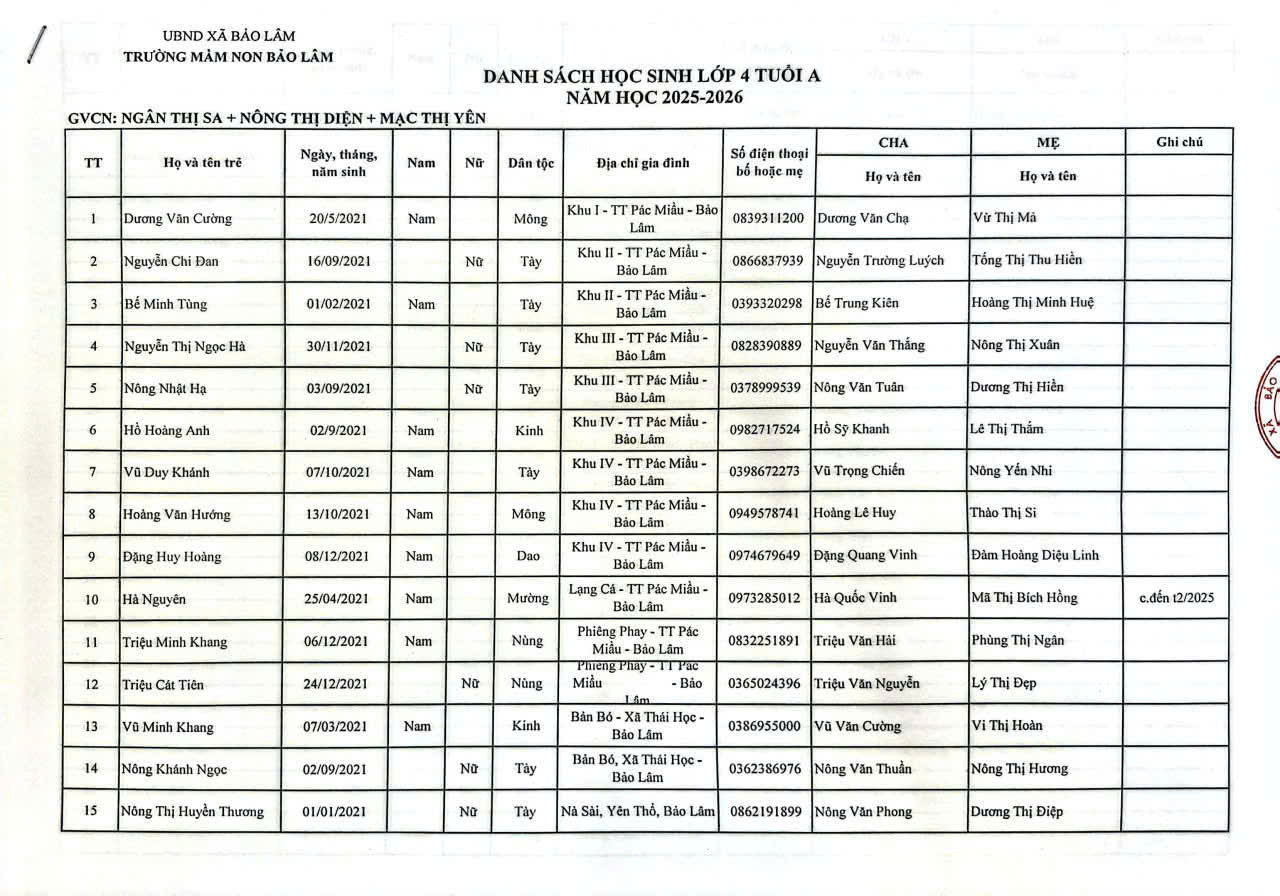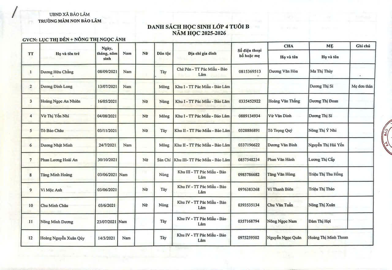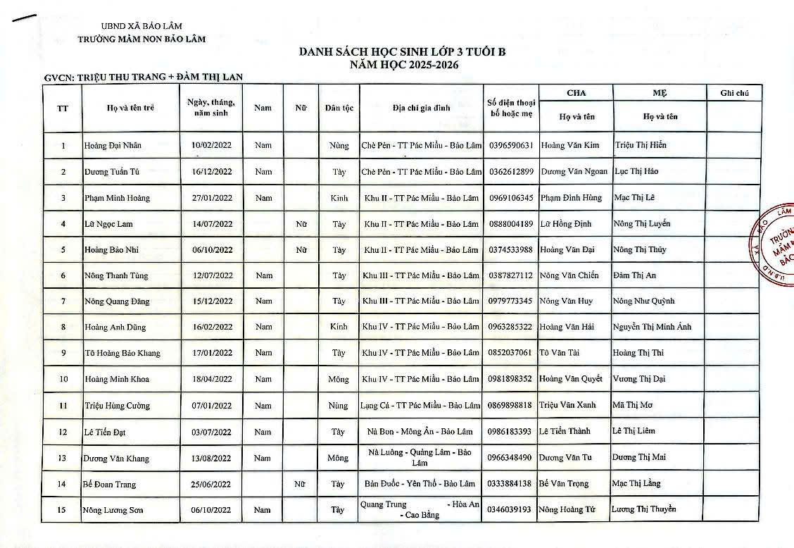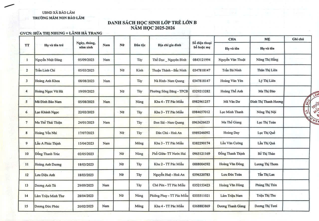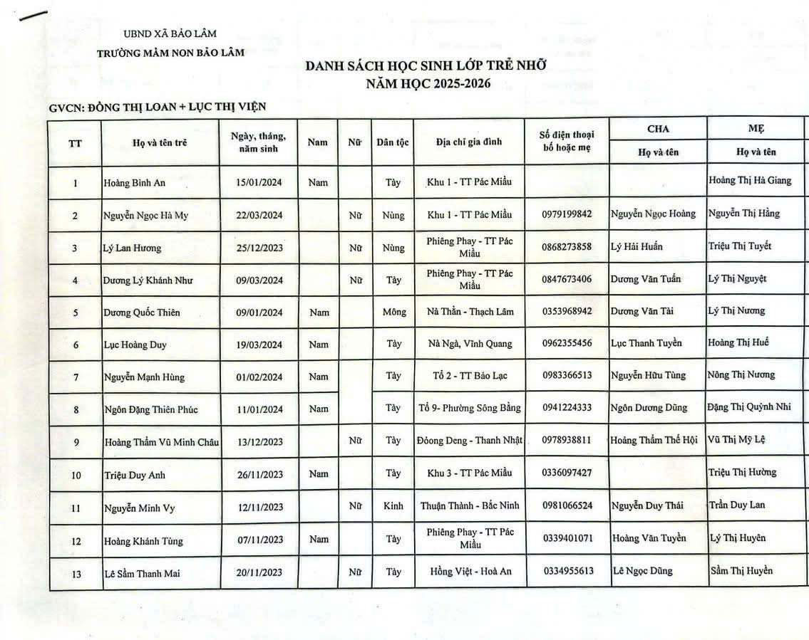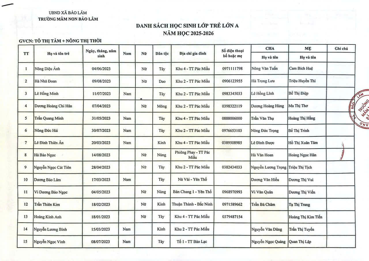 THÔNG BÁO DANH SÁCH PHÂN LỚP NĂM HỌC 2025-2026 11/08/2025 698 4 minutes read Trường mầm non Bảo Lâm trân trọng thông báo tới các bậc phụ huynh danh sách lớp học năm học 2025-2026 như sau: