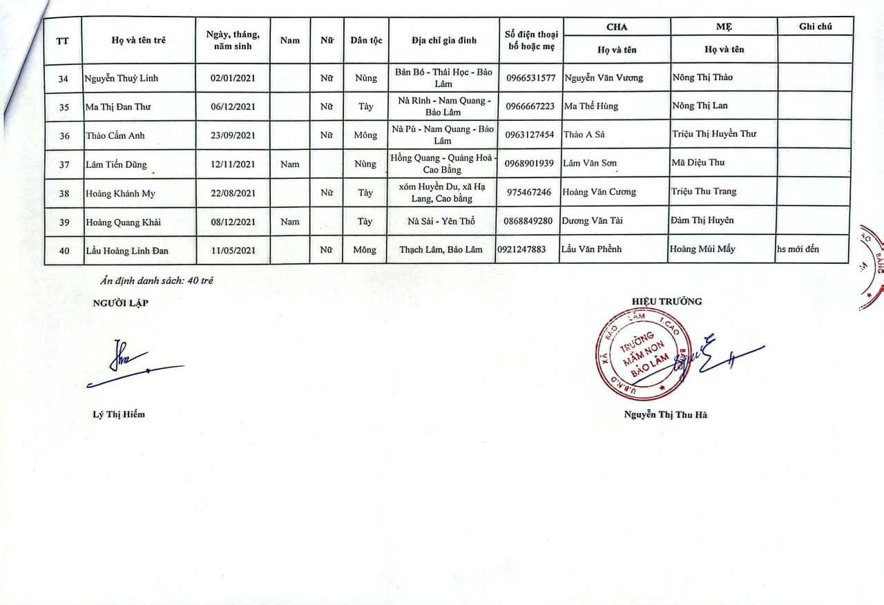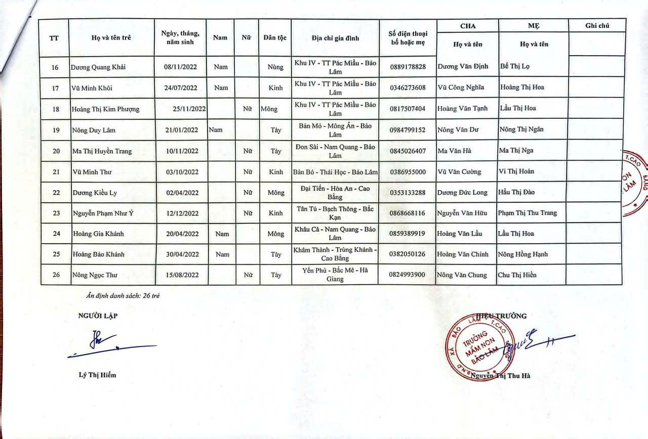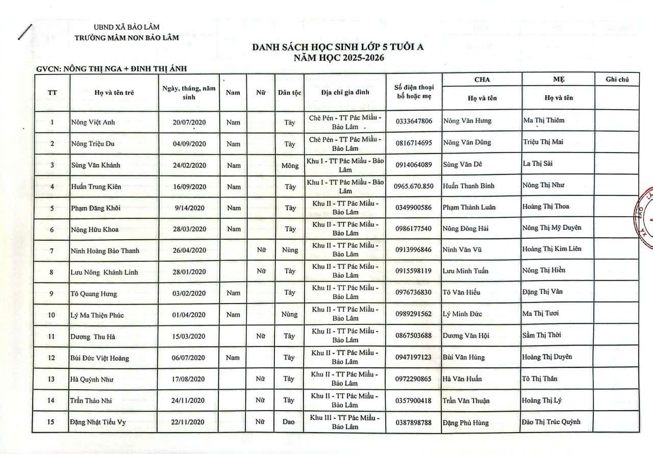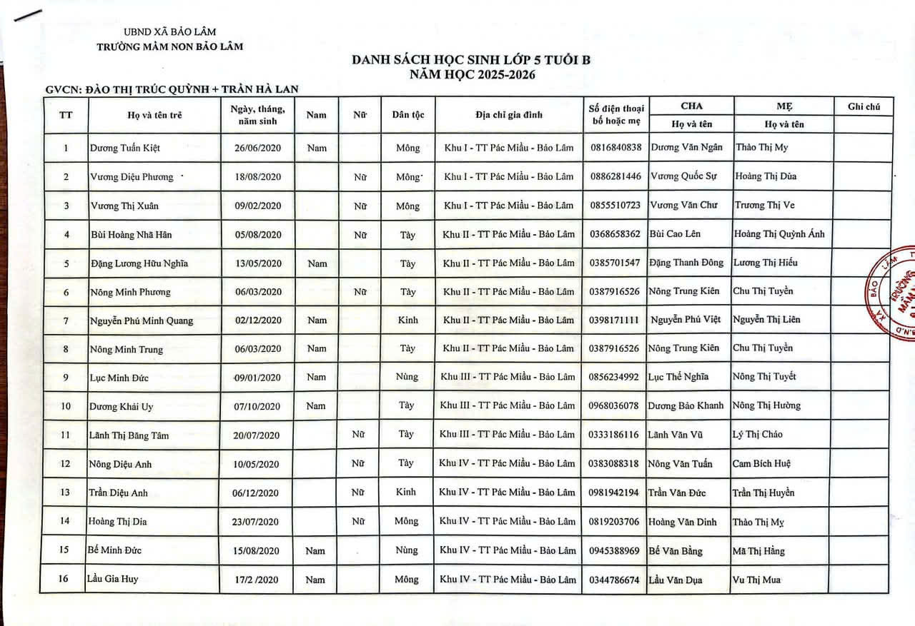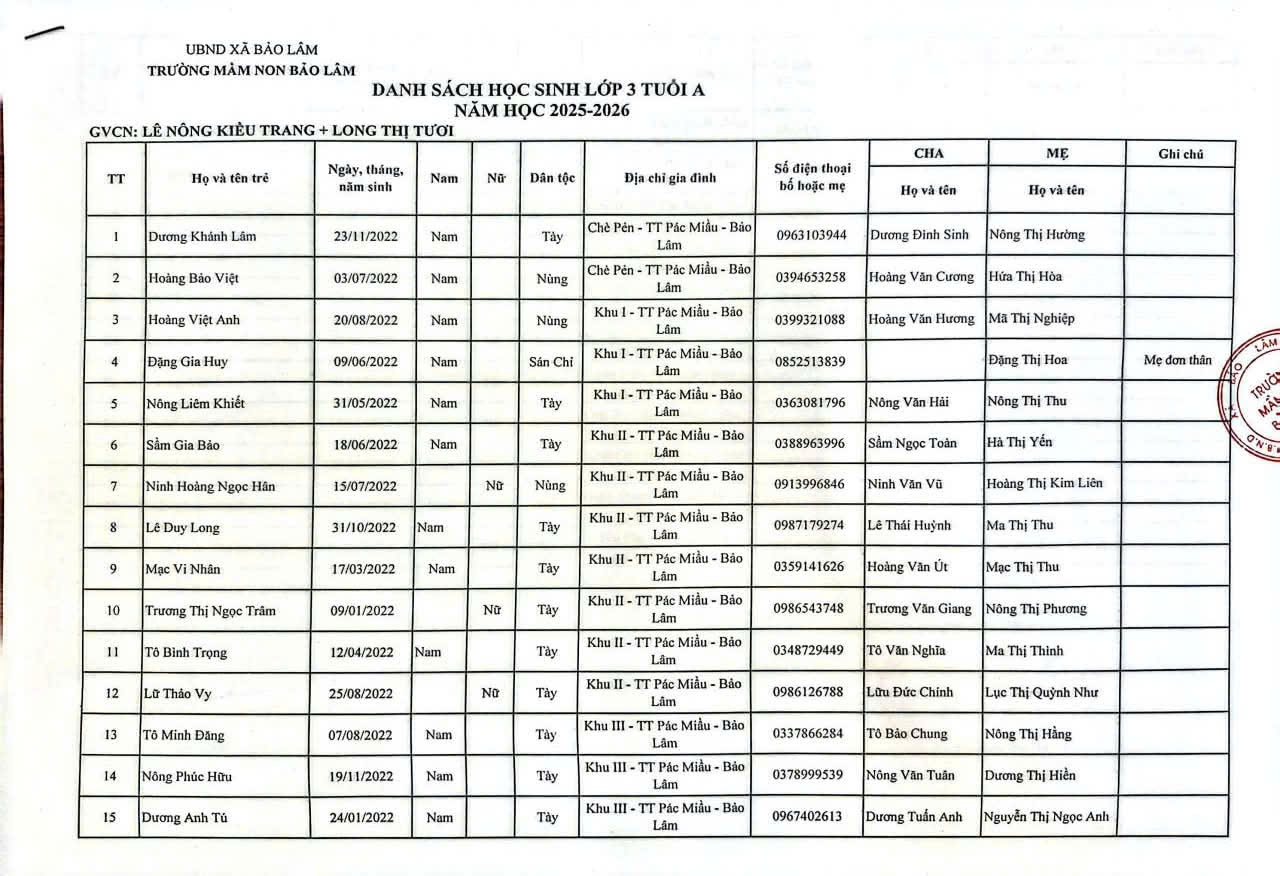 THÔNG BÁO DANH SÁCH PHÂN LỚP NĂM HỌC 2025-2026 11/08/2025 698 4 minutes read Trường mầm non Bảo Lâm trân trọng thông báo tới các bậc phụ huynh danh sách lớp học năm học 2025-2026 như sau: